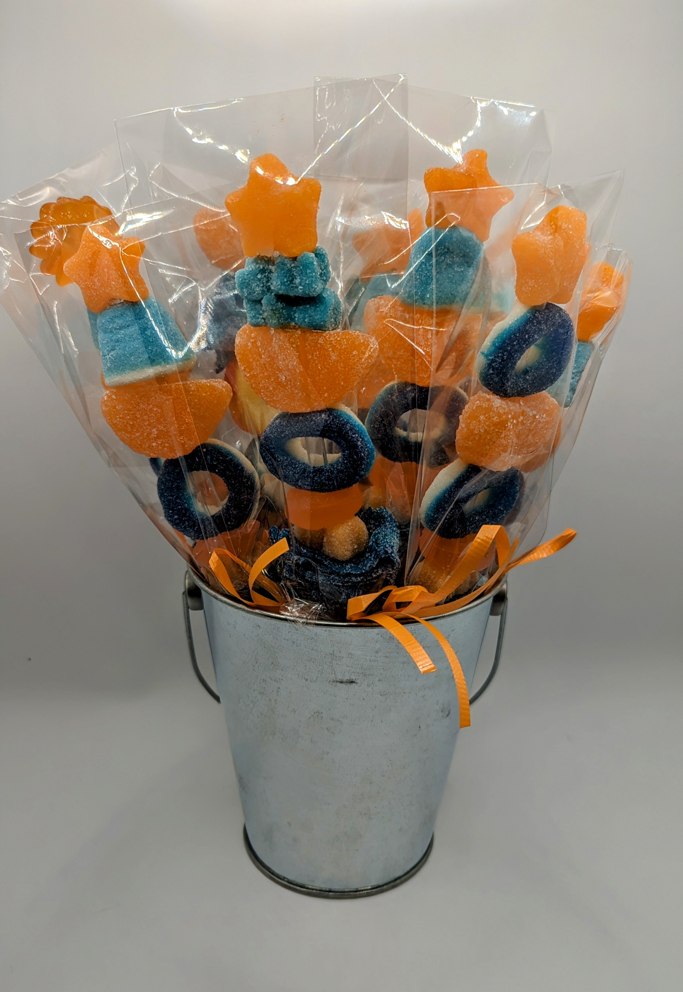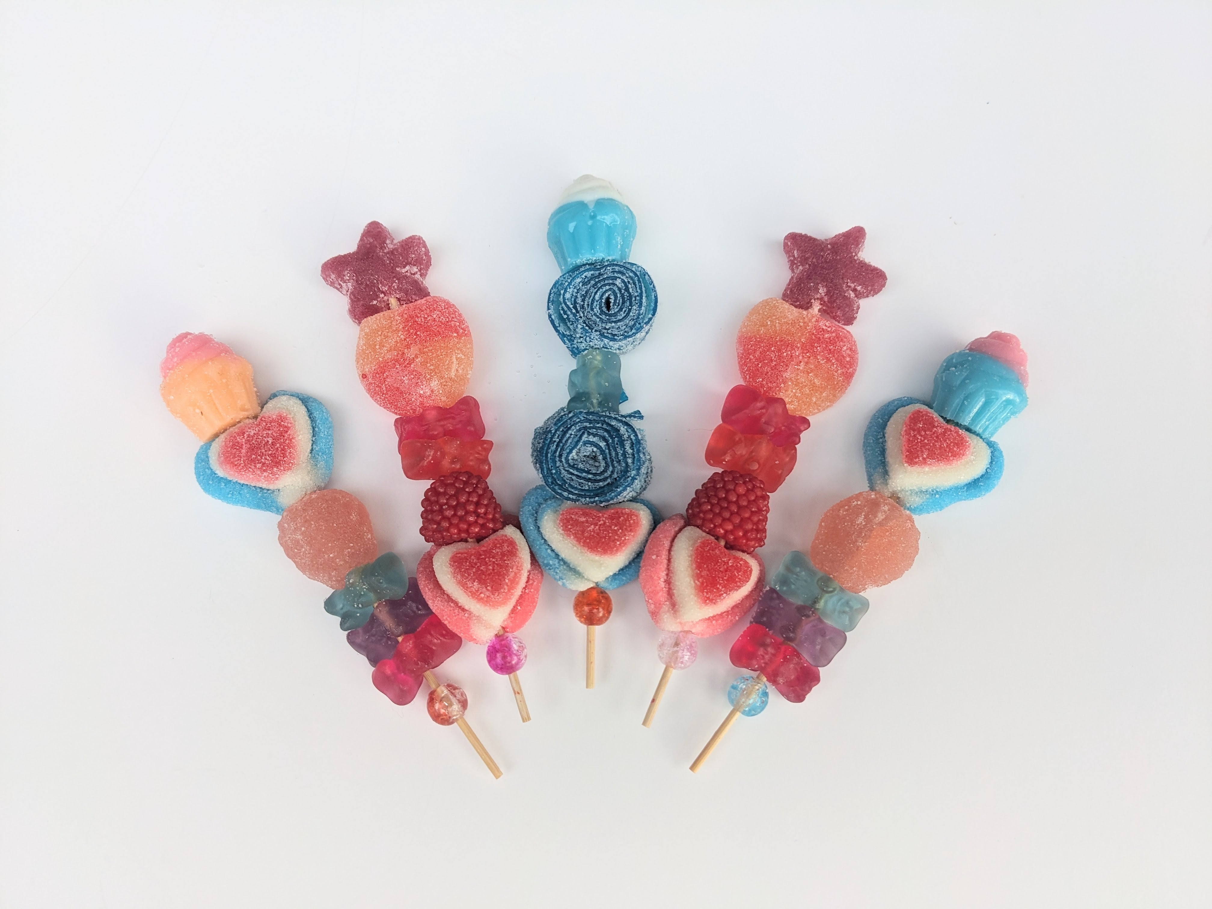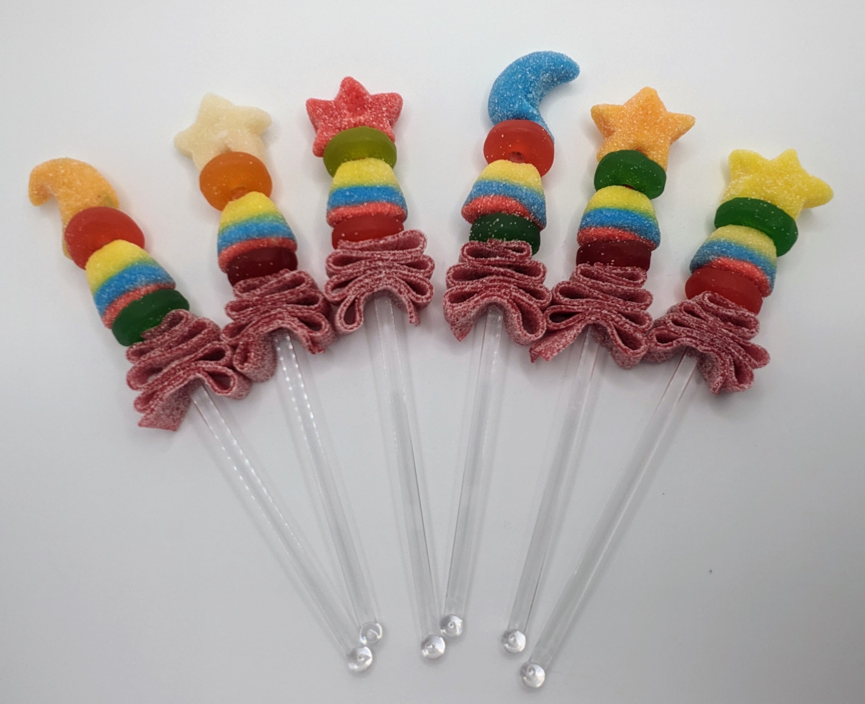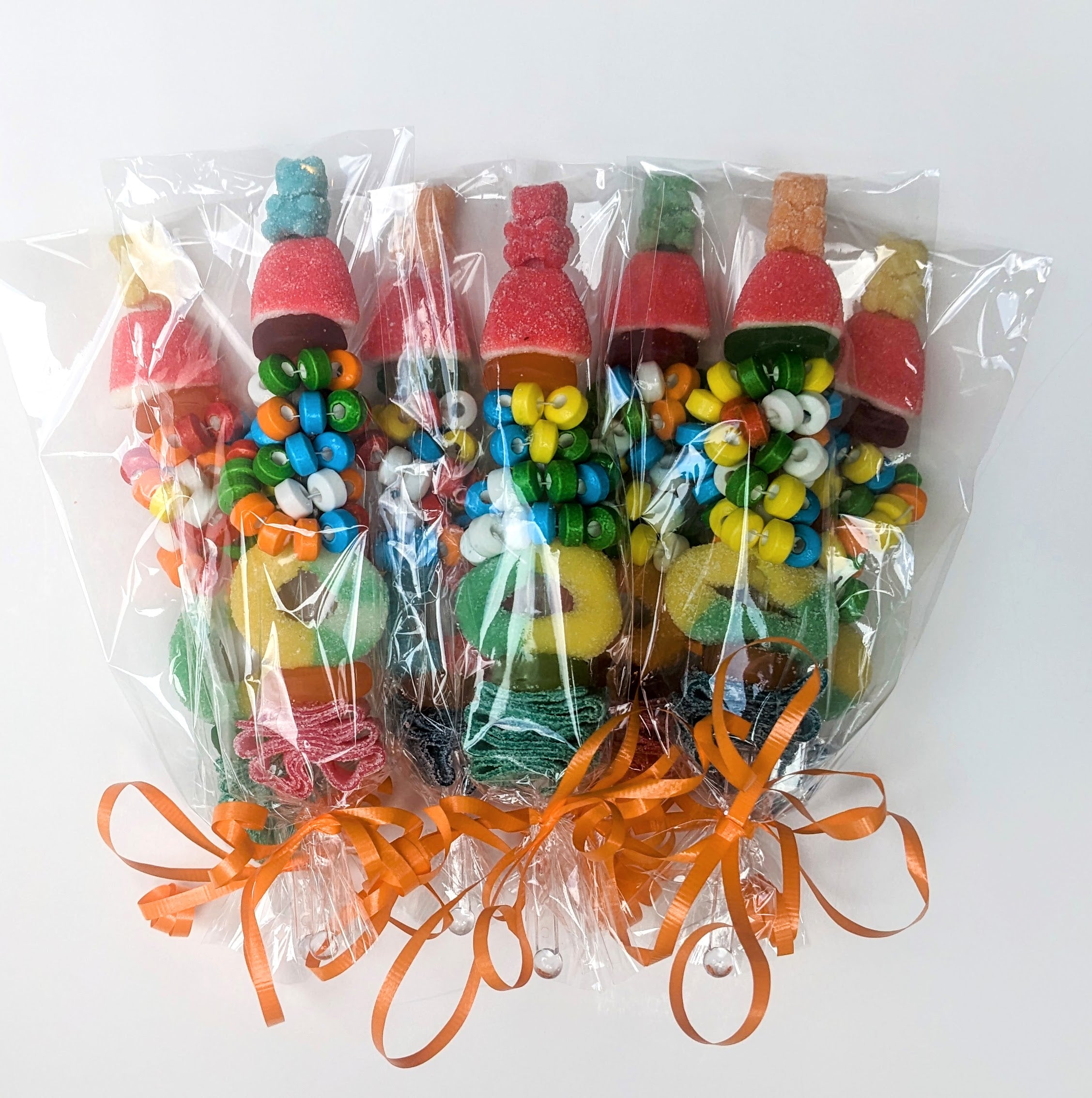 7-inch swizzle sticks with approximately 6-8 pieces of candy (depending on candy size), and may include gummy bears, rings, sour belts, marshmallows, candy bracelets and more.